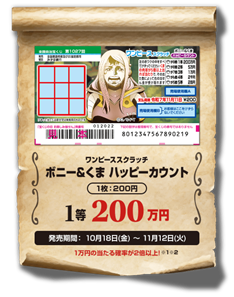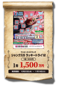 (ワンピーススクラッチの当せん確率については、宝くじ公式サイトでは販売枚数の発表がされていないため、おおよその確率となります)