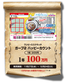 (ワンピーススクラッチの当せん確率については、宝くじ公式サイトでは販売枚数の発表がされていないため、おおよその確率となります)