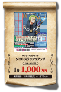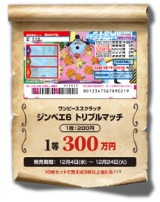 (ワンピーススクラッチの当せん確率については、宝くじ公式サイトでは販売枚数の発表がされていないため、おおよその確率となります)