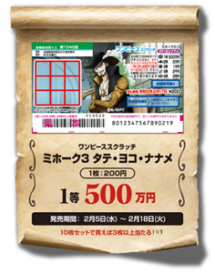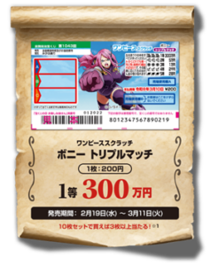 (ワンピーススクラッチの当せん確率については、宝くじ公式サイトでは販売枚数の発表がされていないため、おおよその確率となります)
