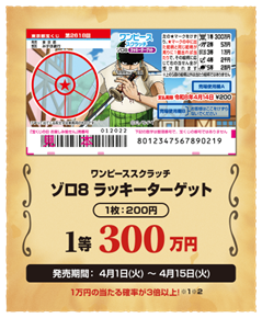 スクラッチによって、「10枚セットで買うと必ず3枚は当たる!」や「1万円の当たる確率が3倍以上!」などの特徴があります。この特徴に関しては宝くじ公式サイトのワンピーススクラッチ特設サイトで確認してみてください。